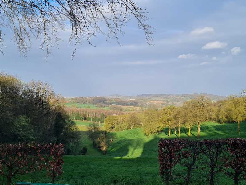 De super paysages lors d'une soirée ensoleillée: jacinthes fleuries, monts, abbaye, sous bois, ..